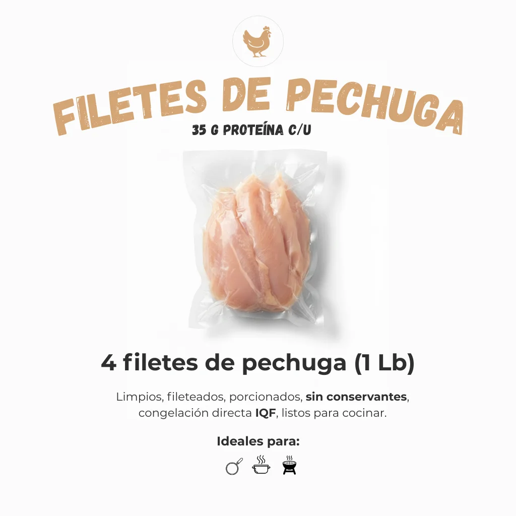 Prepara comidas saludables y deliciosas con nuestros filetes de pechuga de pollo, limpios, porcionados y congelados para tu comodidad 🐔💪.